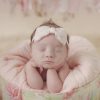 Pink satin bow wrapped in a soft ivory lace centred with a pearl button on a soft ivory elastic headband.