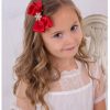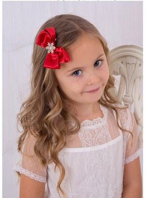 Red large double satin bow with snowflake rhinestone button on an alligator clip.