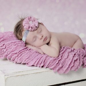 Beautiful dusky pink chiffon ruffle flower decorated with a beautiful pearl and diamante rhinestone on a soft lace headband