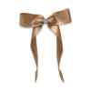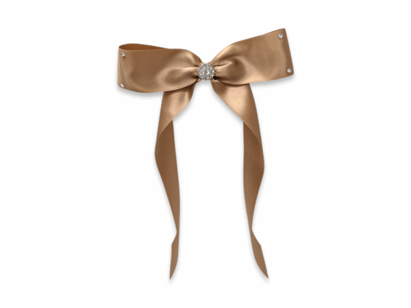 Satin bow with long tails and rhinestone button and Swarovski crystals on an alligator clip.