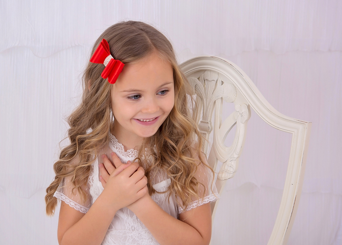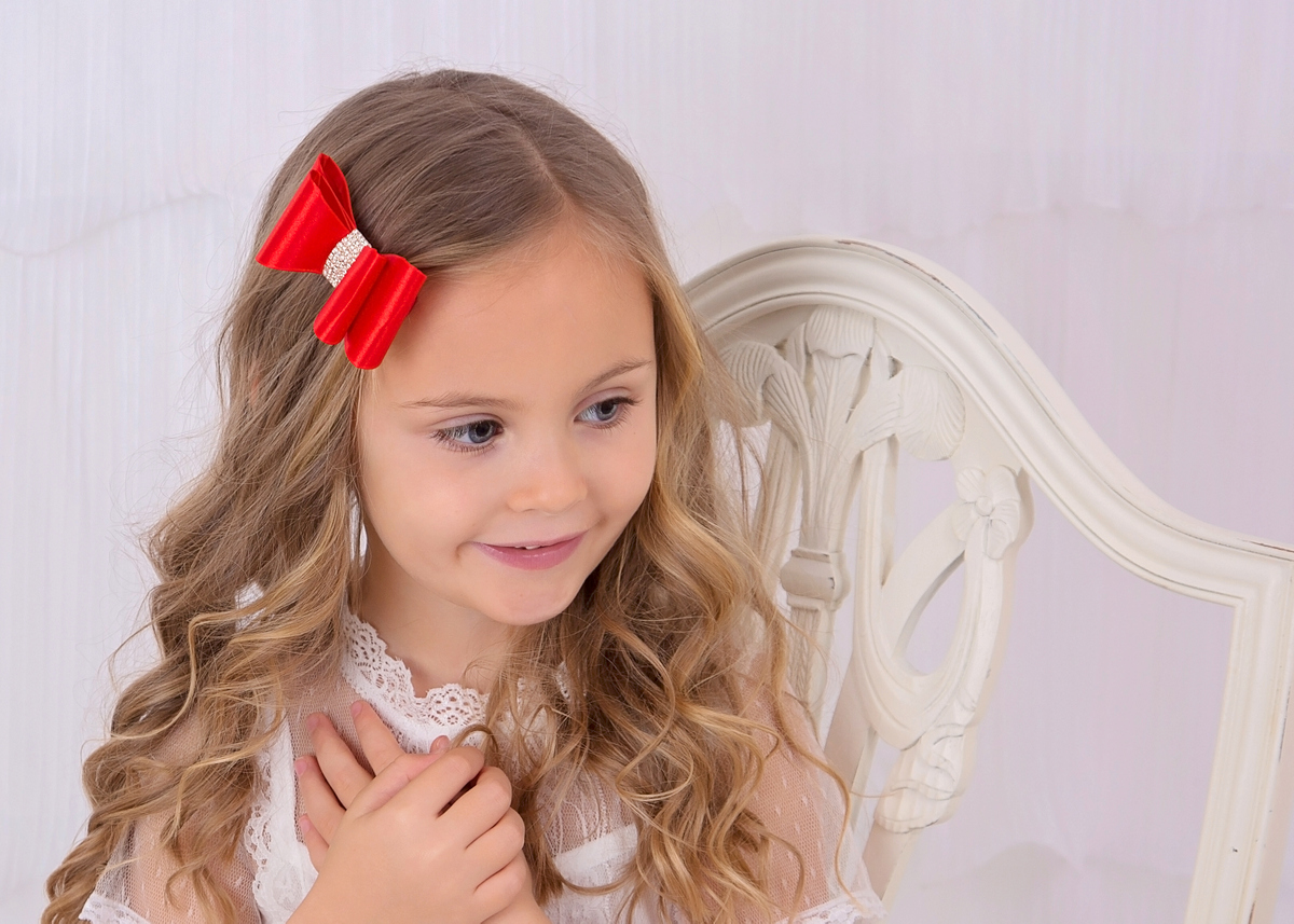 Satin stiff red bow with long rhinestone button on an alligator clip