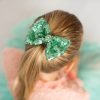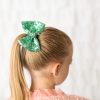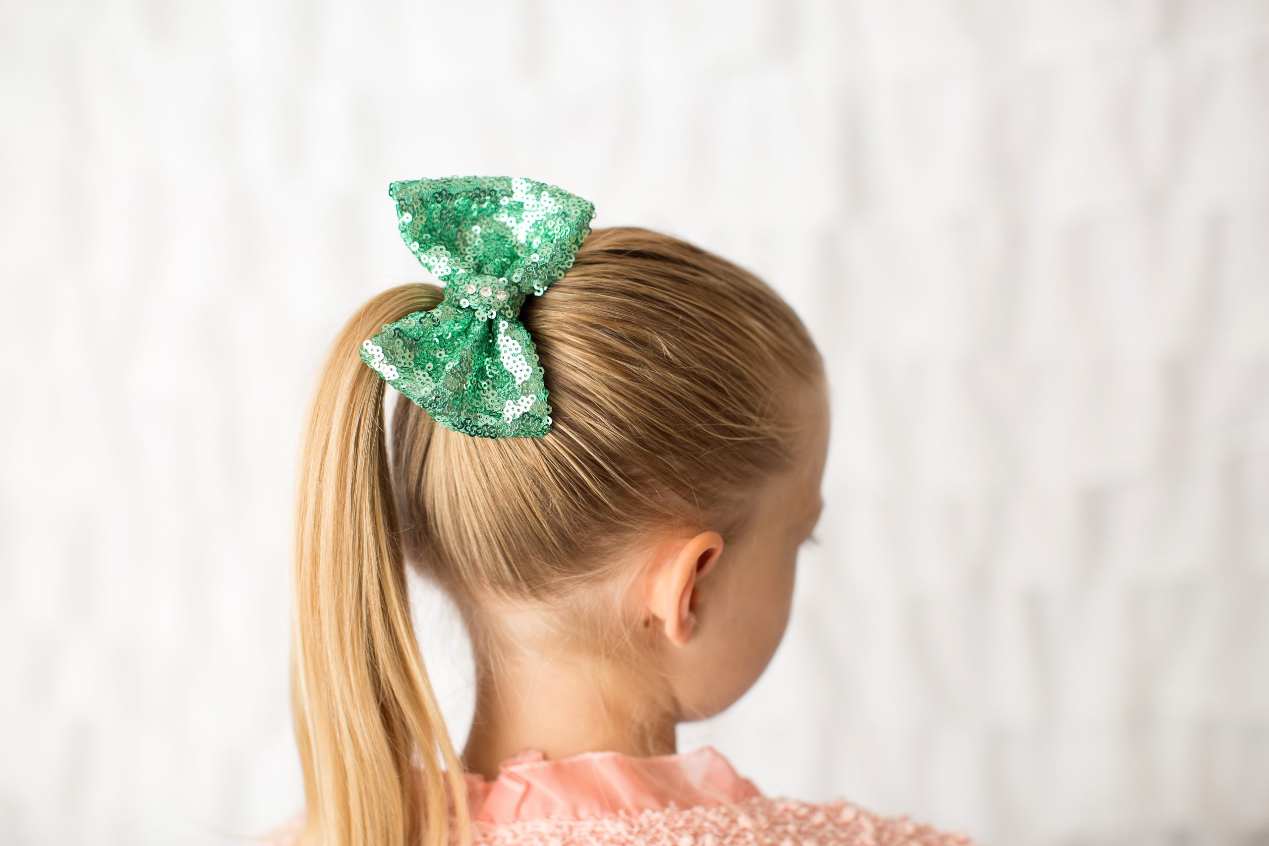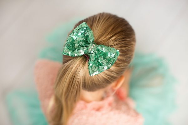 Sequin bow in mint green decorated with Swarovski crystals on a clip.