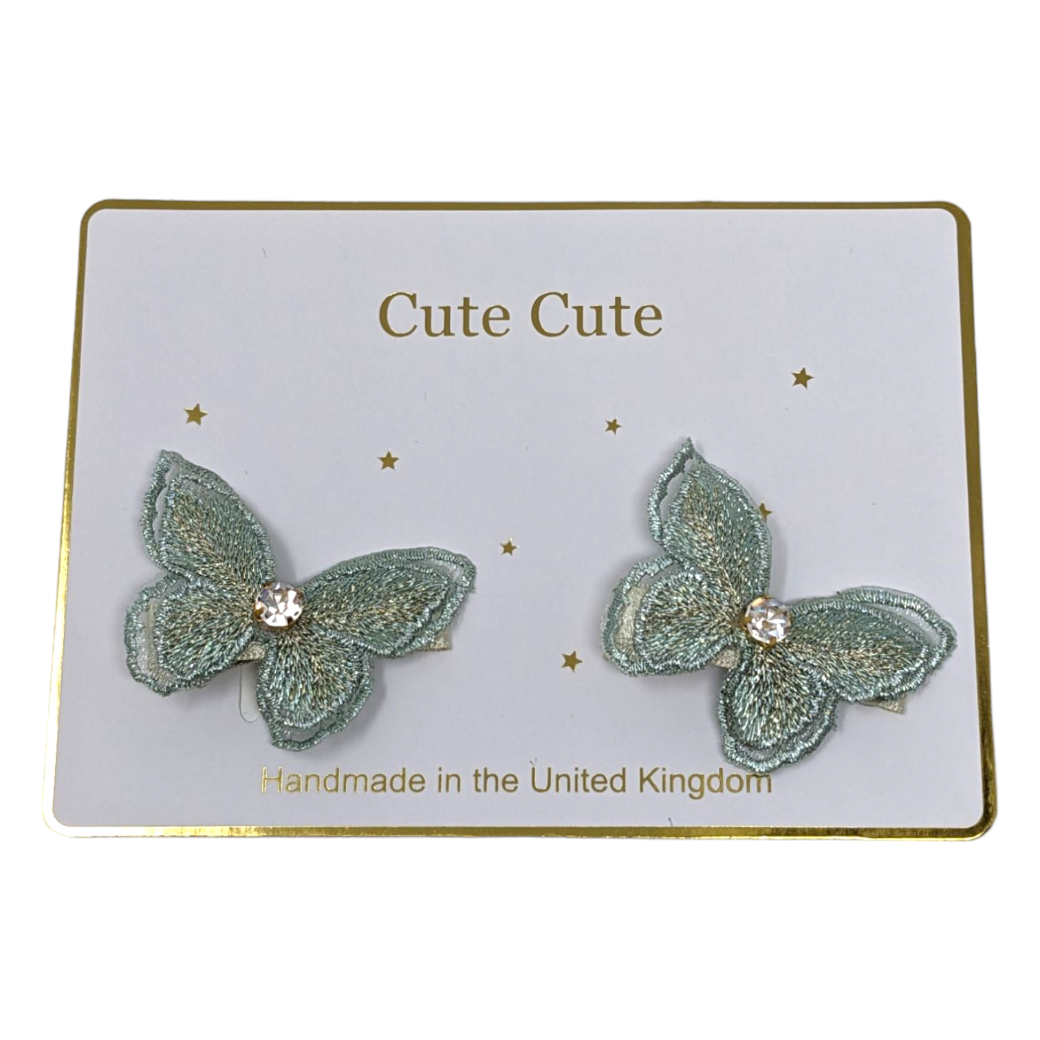 Set of two green butterflies with gold cased rhinestones on alligator clips