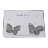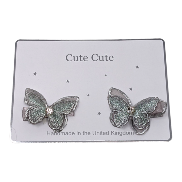 Set of two grey butterflies with silver cased rhinestones on alligator clips