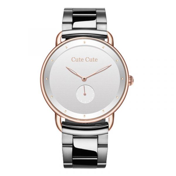Silver and rose gold watch with a silver face and stainless steel bracelet