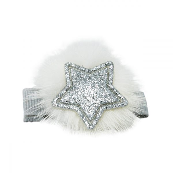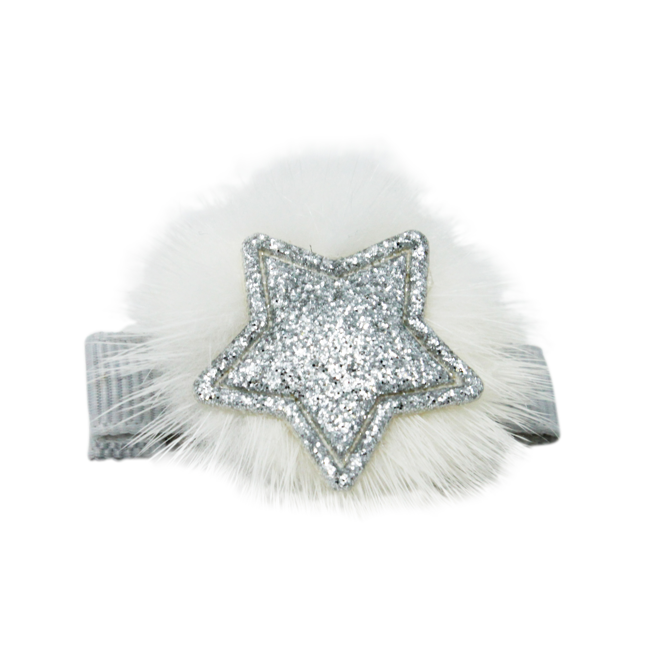 Silver glitter star on ivory pom pom on a alligator clip