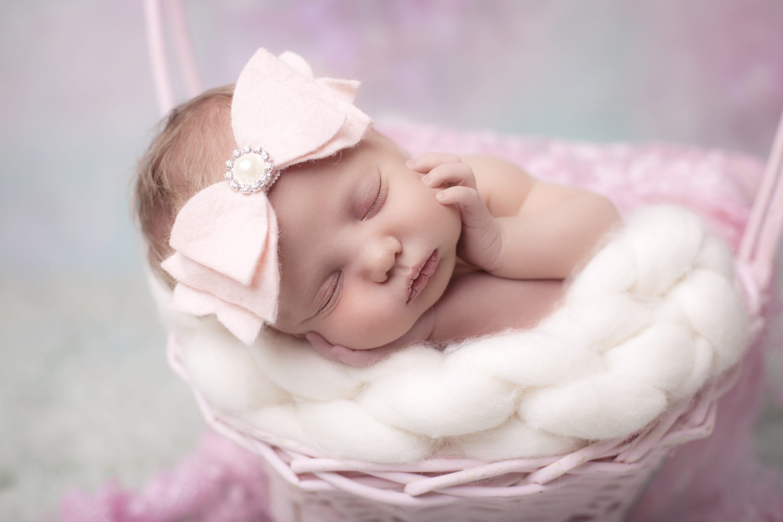 Soft felt bow in pink with pearl and diamante rhinestone on lace