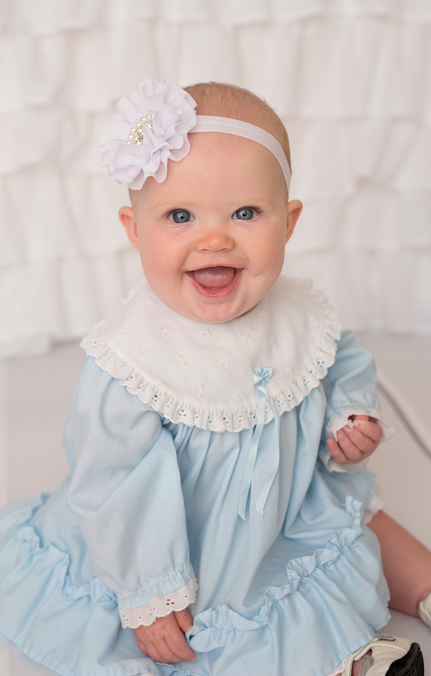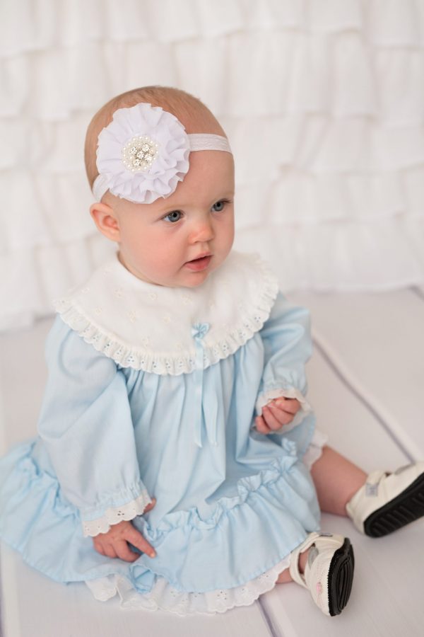 White chiffon flower with pearls and stones on soft elastic headband