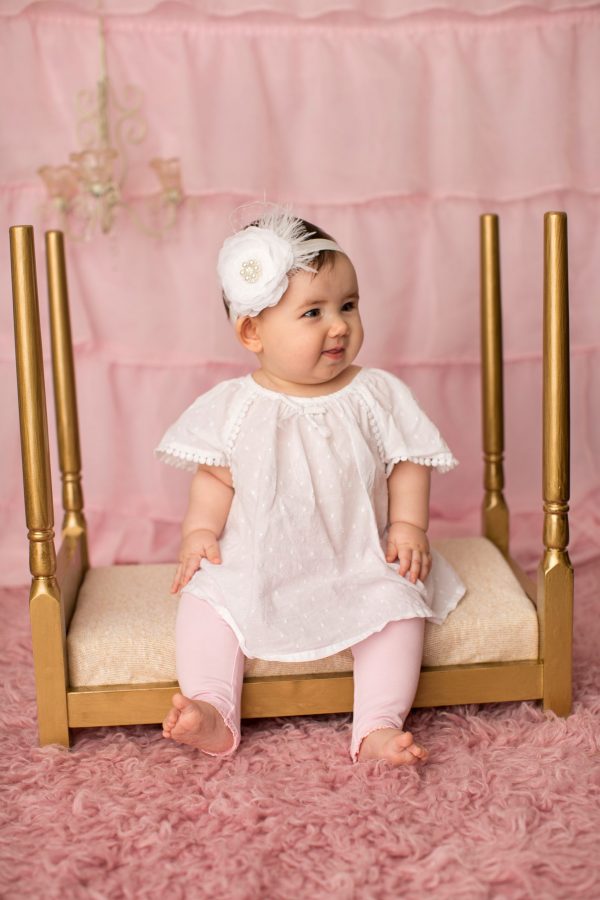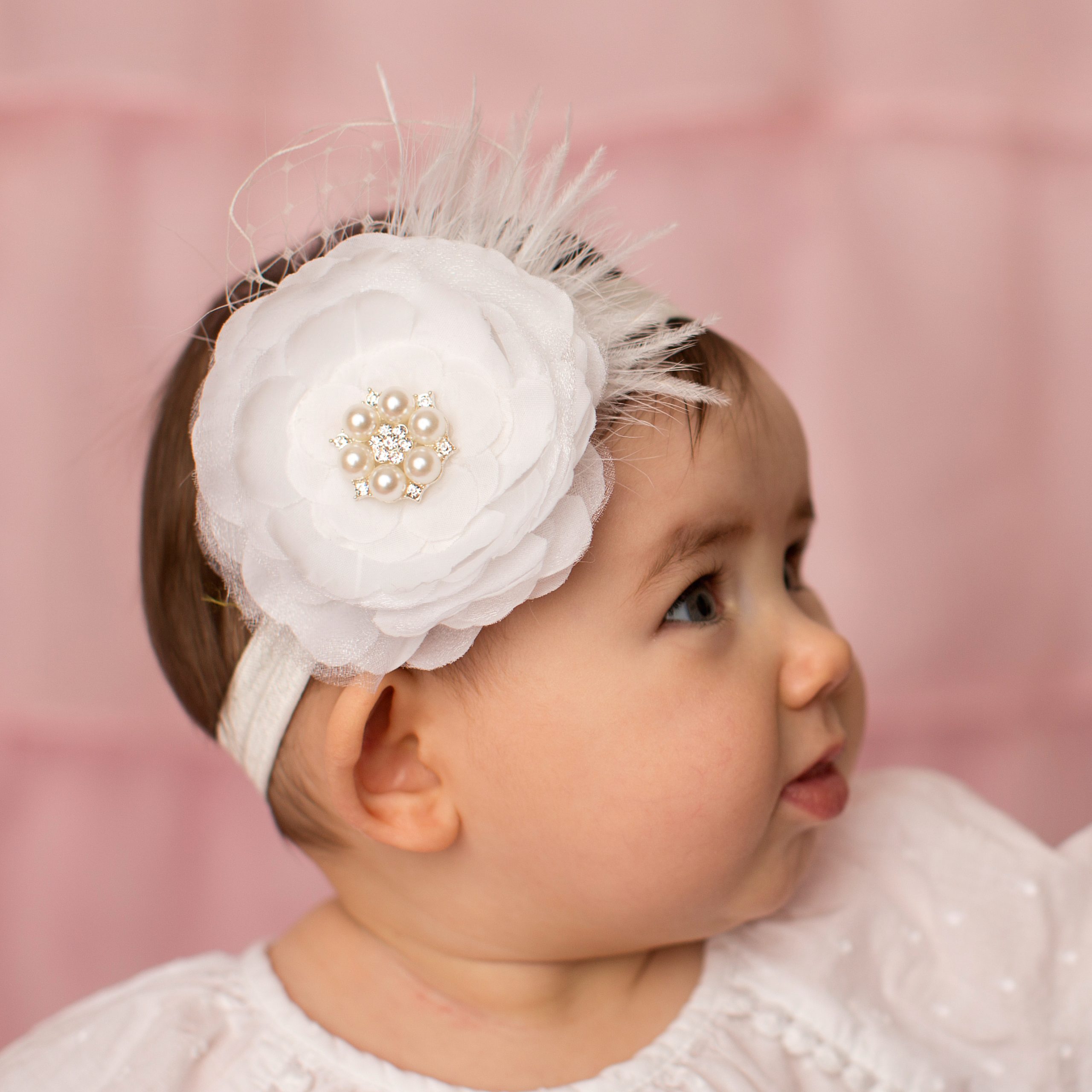 Beautiful white silk layered flower with pearl and stone finished with marabou feather and delicate net veil on a soft elastic headband