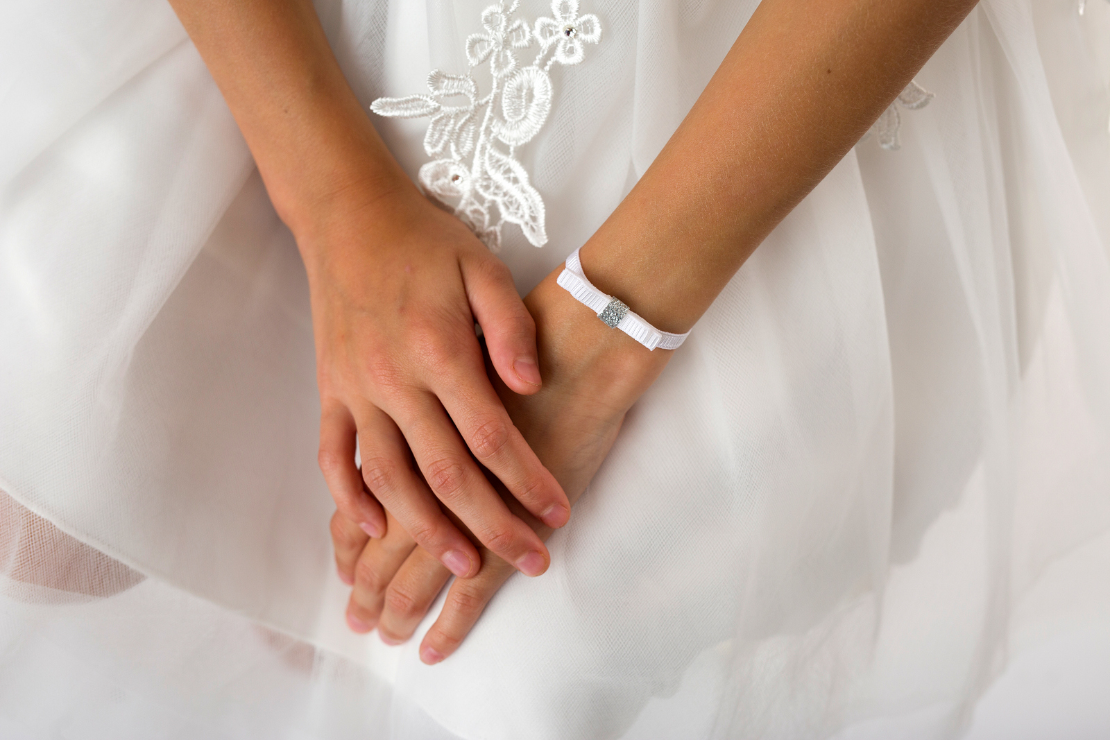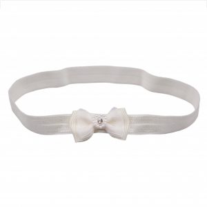 White ribbed small bow with silver middle on a soft elastic bracelet