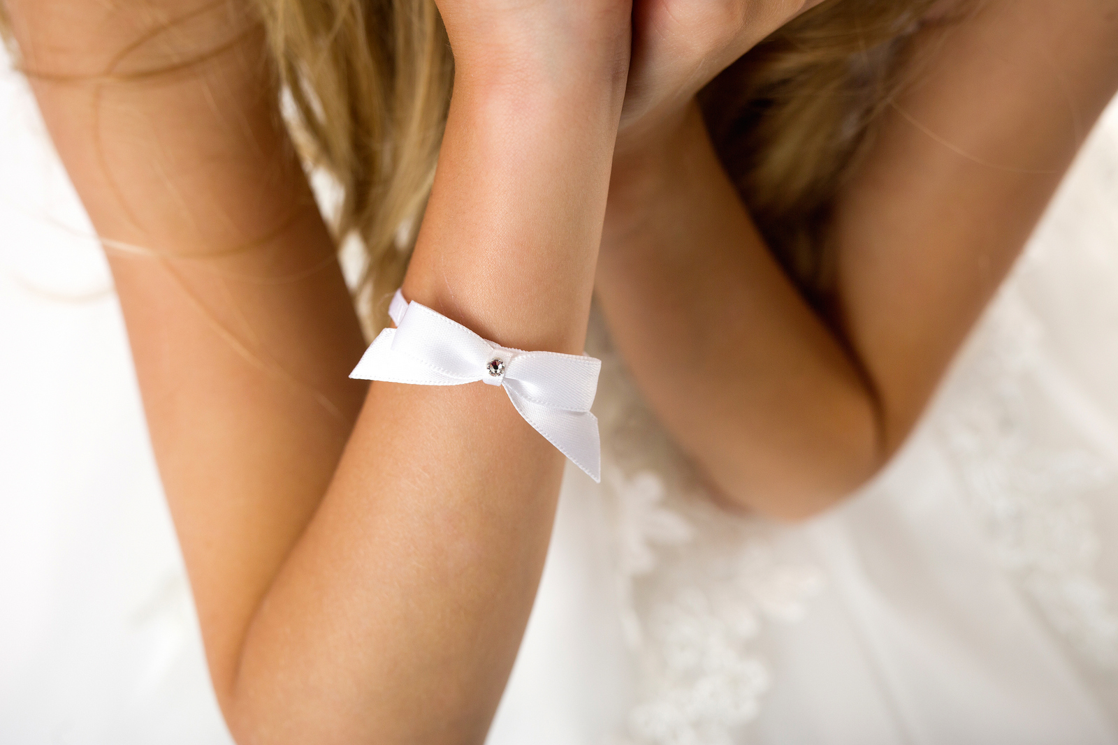White satin small bow with Swarovski on a soft elastic bracelet