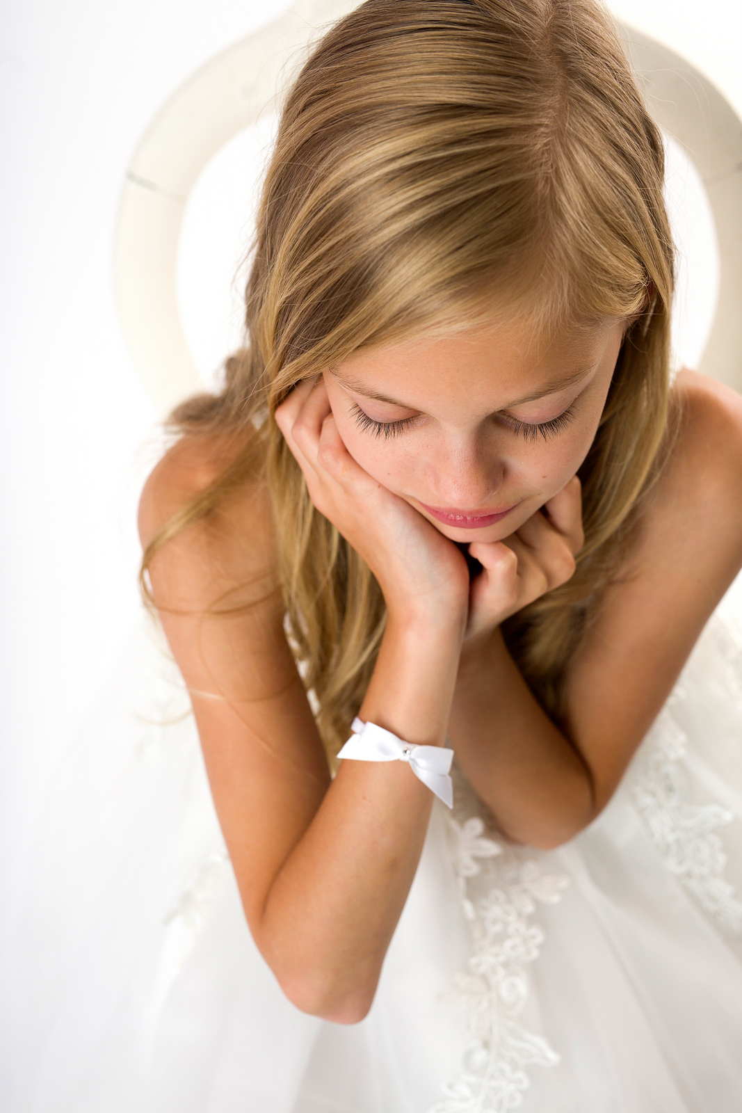 White satin small bow with Swarovski on a soft elastic bracelet.